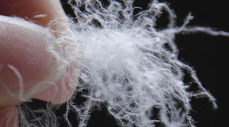 在这团毛球的中心是一个绒核,绒核上长有密集的绒丝,这些绒丝向不同方向延伸,形成了一个网状结构。如果我们再将其放大来看,会发现每一根细小的绒丝都是由若干个更细小的鳞片所构成的,而这些鳞片全部都是中空结构。每一根绒丝上都存在着很多个菱节,而菱节中包含着不流动的空气。在这些绒丝交错形成的网状结构中,更是保有大量的空气。事实上,真正起到保温作用的就是空气,而羽绒的作用则是利用自身的结构保持空气。
