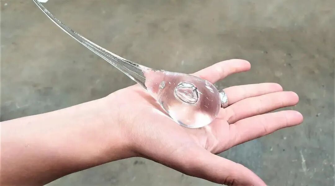 本质上它就是一个水滴形状的玻璃制品,但它的独特之处在于,这个玻璃水滴的头部极其坚硬,刀砍、斧剁、锤子砸都不能伤其分毫,就算是用手枪打,结果也是子弹粉碎,而鲁伯特之泪却毫发无损。一个玻璃制品能有如此硬度,的确令人惊讶,但如果只是这样,还算不上有趣,相比头部的坚硬,鲁伯特之泪的尾部却异常脆弱,只需要用力一捏就会碎成粉末,而且碎成粉末的不仅是尾部,而是整个鲁伯特之泪。这么有趣的东西是怎么制造出来的?其实这并不是什么高科技产品,它的诞生可以一直追溯到17世纪。