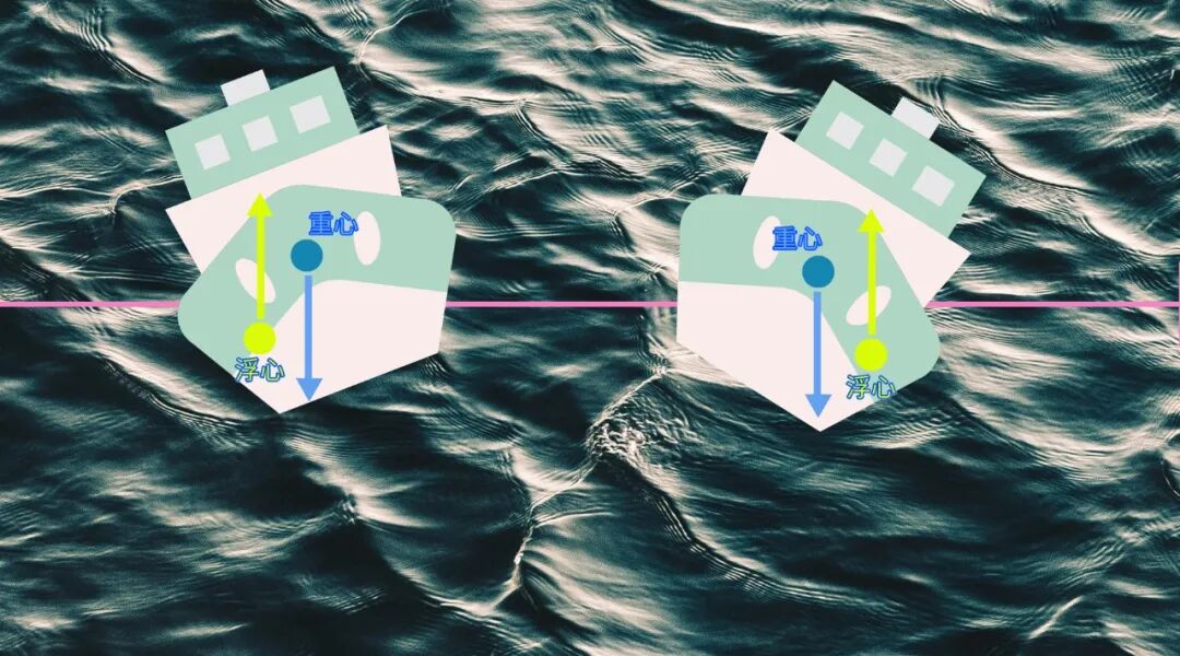 然而,船只并不可能永远平稳地航行在水面上,事实上每时每刻船只都在晃动。当一艘船因海面的波浪而向右倾斜时,船的重心位置是不会发生任何变化的,因为只要物体的体积和形状不发生改变,重心也就不会变化。可浮心就不一样了,当船体向右倾斜,右侧的排水体积就会大于左侧,而浮力是作用于排水部分的船体的,所以此时浮心也会向右移动,这个时候,重心与浮心可就不在一条垂直于睡眠的直线上了,于是这两个方向相反的力就会产生一个扭力,把船体从向右倾斜的状态扭回来。