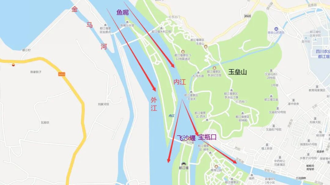通过下面的都江堰结构示意图可以看出,李冰父子选择修建都江堰的位置正好位于岷江的一个转弯处,他们在江水转弯的位置修建了一个用于分流的岛形工事,这个分流岛的前端位置就被称之为“鱼嘴”。鱼嘴左侧被称为外江、右侧被称为内江,而内江部分的水最终会通过下面的宝瓶口流往成都,这里面是存在机巧的。李冰在设计的时候,将内江设计得比外江深,而水面部分,外江又比内江宽,这种设计使得成都地区枯水期不会缺水,而丰水期又不会被淹,为什么呢?