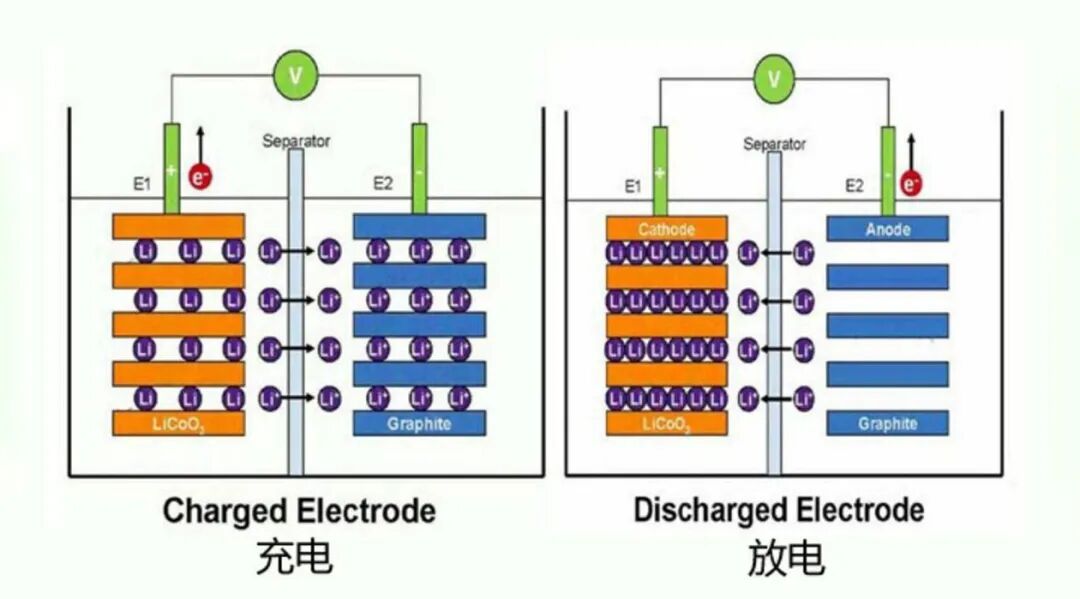 同样,放电的时候,锂原子会再次分解为锂离子和电子,锂离子还是从隔膜回到正极,而电子则通过外电路回归正极,中途经过用电器为其提供电能。