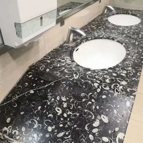 一个多月前,中国矿业大学地质系陈尚斌主任去贵州出差,在贵阳机场的男厕所里,发现洗手台所使用的石材有些特别,似是化石。拍照发朋友圈。