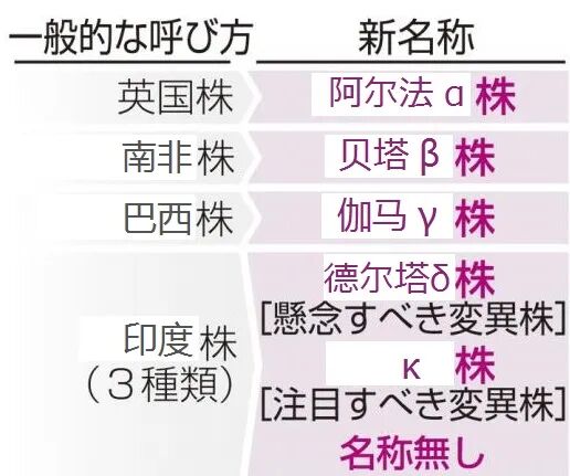 WHO为了避免污名化某国或某地区,提倡将在英国、巴西、印度等国发现的变异病毒,以希腊字母来称呼。在此提倡发出之前,普通人一般习惯以英国型、巴西型、印度型来区分。