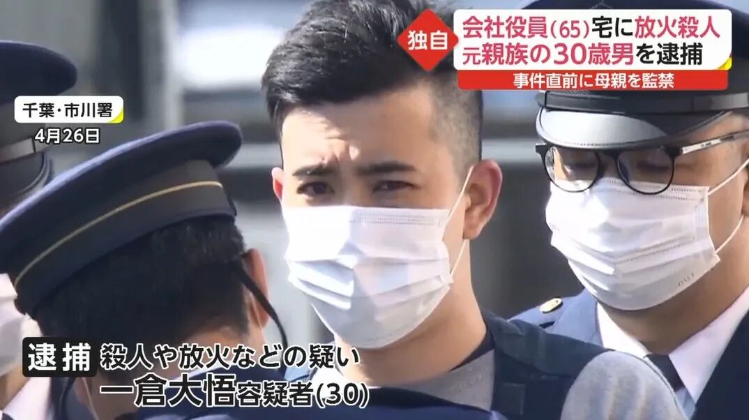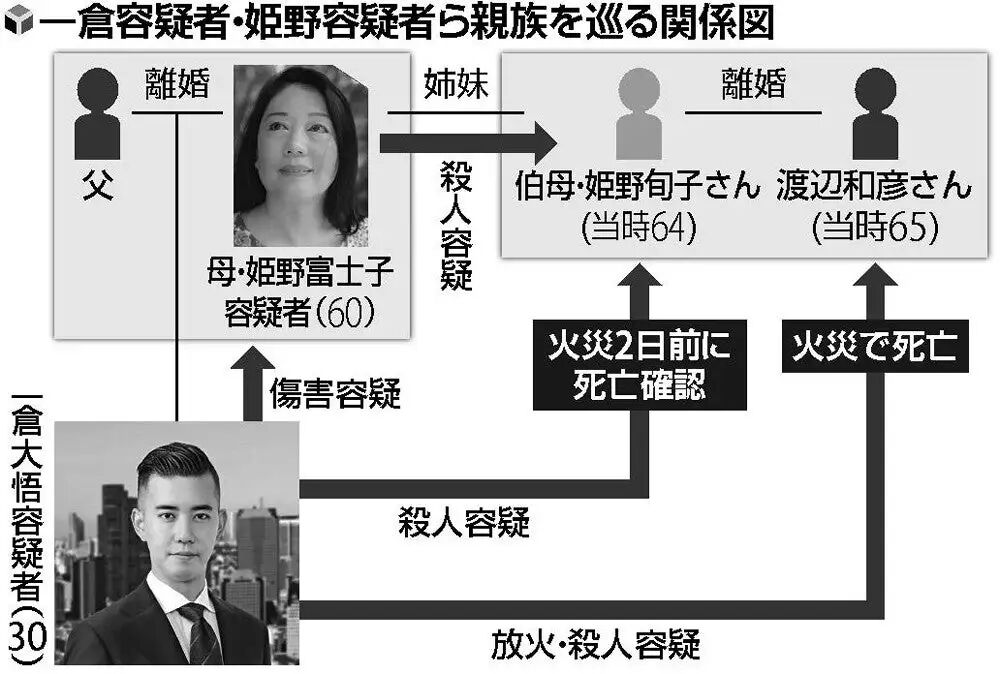 嫌犯:一仓大悟,涉嫌杀害了姨妈姬野旬子、前姨父渡边和彦;涉嫌纵火;涉嫌暴力伤害、非法拘禁亲妈姬野富士子。
