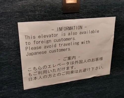 同时,还有其他网友在电梯里拍到一张A4纸打印的告示:这儿的电梯,外国客人也能使用。请避开与日本人一起乘坐。