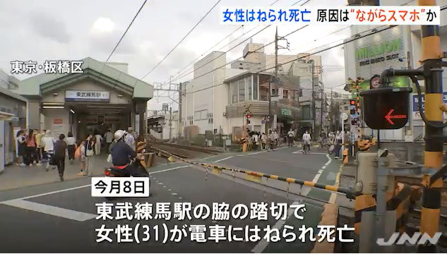 7月8日,日本东京板桥区的一处电车轨道口,一名31岁女子在等待电车通过时,被飞驰而来的电车当场撞死。