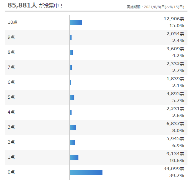 到截稿为止,已有85881人参与投票打分,其中34099人选择了0分,占整体的39.7%。