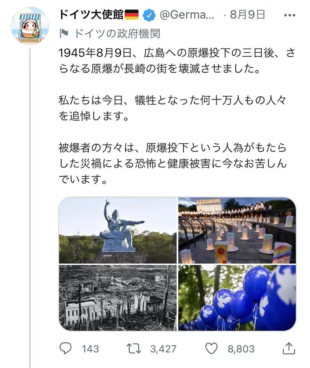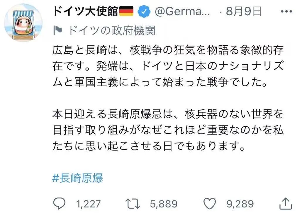 不过,8月9日这天,德国驻日大使馆的一条推特狠狠扒掉日本人给自己穿上的受害者马甲。
