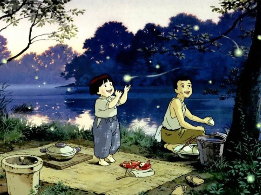 日式反战片中的代表:《萤火虫之墓》。战败前夕,美军空袭神户,变成孤儿的兄妹,妹妹在饥寒交迫中死去。