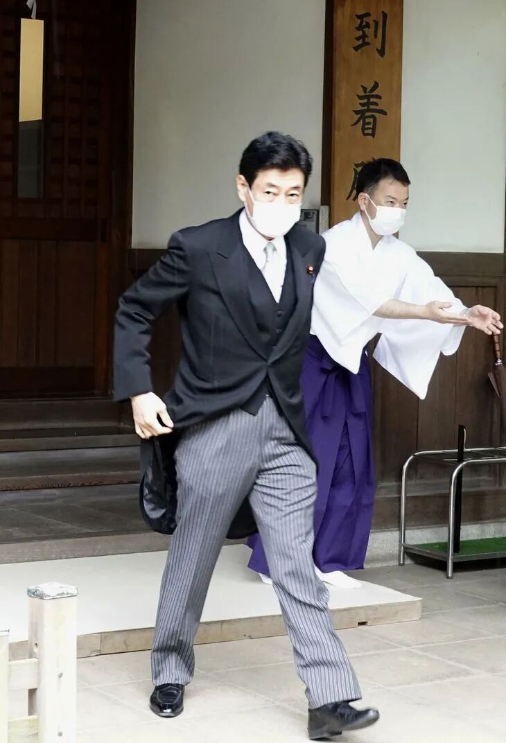 日本文部科学大臣萩生田光一,8月15日当天,身着礼服参拜靖国神社。他是安倍晋三的心腹之一,依托安倍上位。