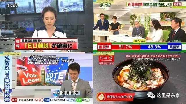 英国跟欧盟分手,其它台立刻转速报直播,东京台在认真介绍静冈县一家烤鳗店老板的午饭——清爽的涮肉片冷乌冬面。