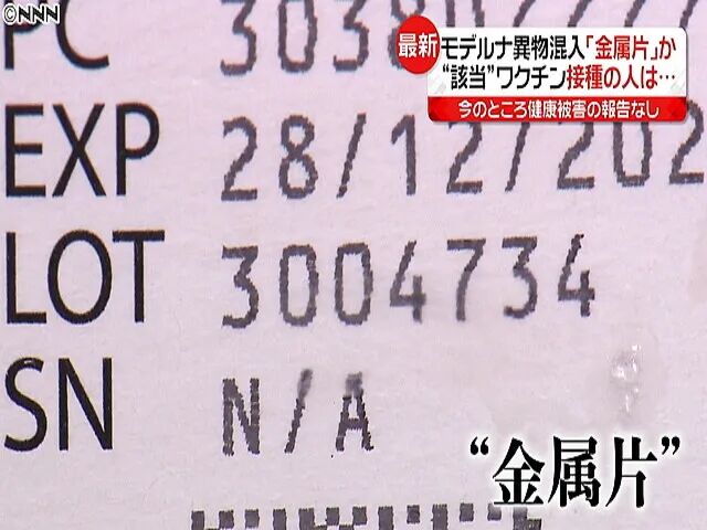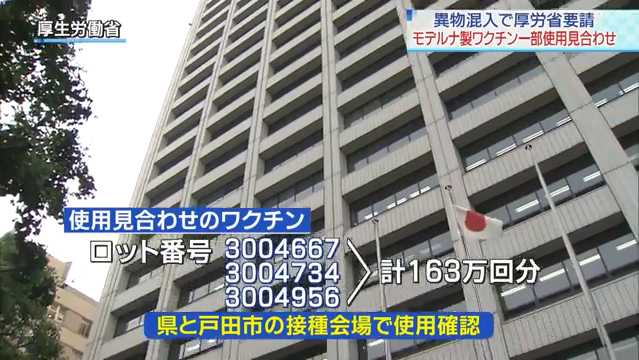 厚生劳动省正式对外公布“莫德纳疫苗混入异物”事件。并决定暂停使用与问题疫苗属于同一作业工序的163万剂莫德纳疫苗。