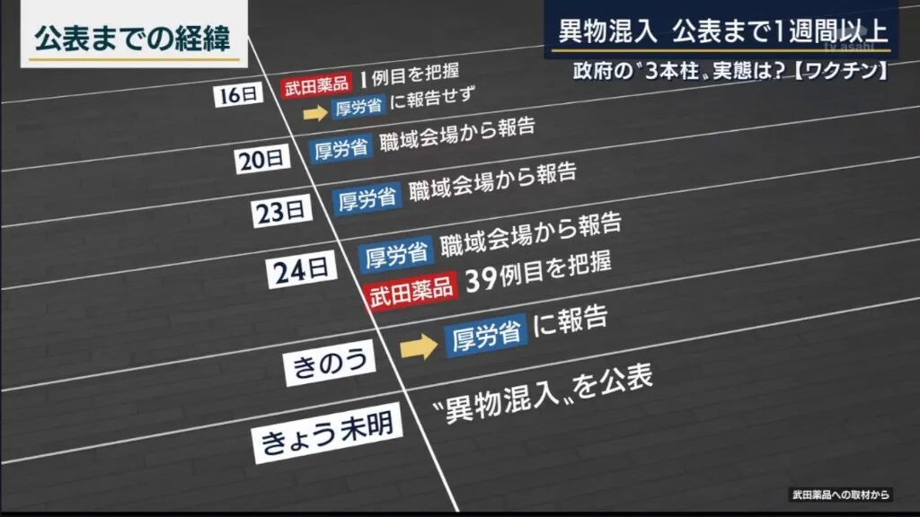 (在这天,武田药品工业还未向厚生劳动省汇报过相关信息。事发后,承认这天已知一件“异物”事例。)