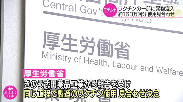 武田药品工业终于向厚生劳动省汇报“莫德纳疫苗混入异物”。