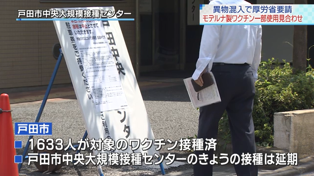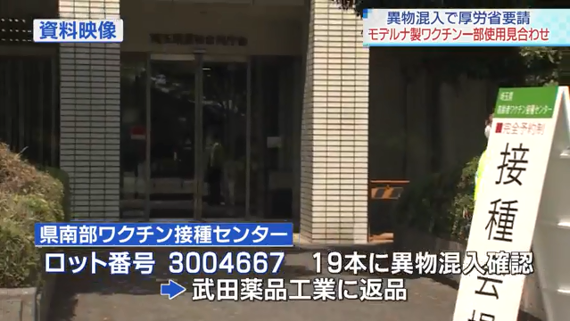 8月10日,埼玉县南部接种中心将发现混入异物的19瓶莫德纳疫苗退给武田药品工业。瓶内未发现异物的疫苗,照常给当天预约的民众接种了。