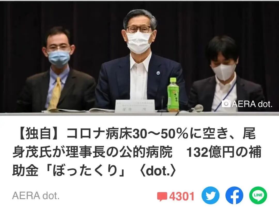 9月1日,著名媒体《AEAR》爆出一条独家大新闻:由尾身茂担任理事长的“地域医疗机能推进机构”(JCHO),旗下5家公立医院的183张新冠专用收治床位,有30%~50%都空着。