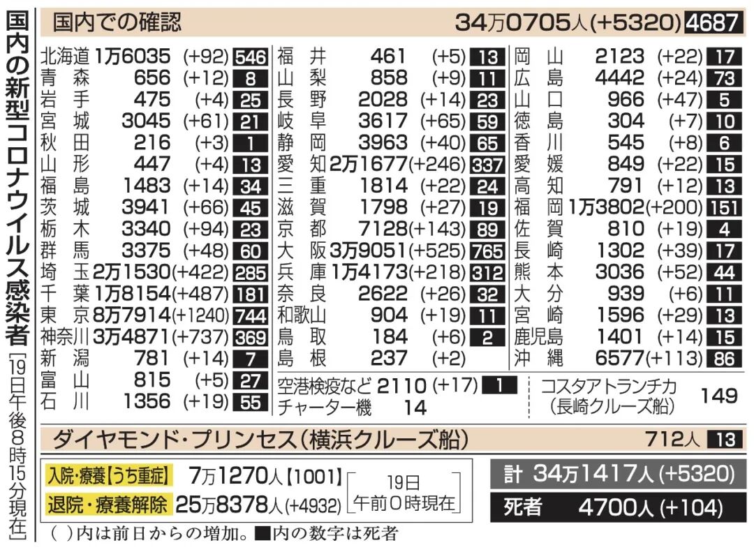截至1月19日,日本国内已确认了的总感染人数为34万705人。