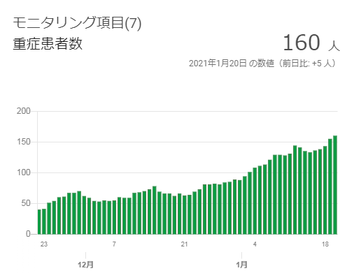 以东京都为例,紧急事态两个星期了,单日新增感染人数从2000人的高位,降到了1500人位置。然而,重症人数却越来越多,达到最高。