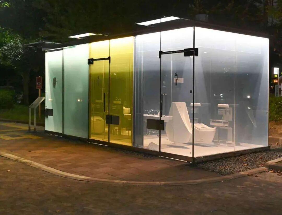 其实玻璃上贴有特殊材质的薄膜。人进去后,只要锁上厕所门,玻璃就会变成不透明的,外面看不到里面。锁一打开,就又变回原本的透明玻璃样。