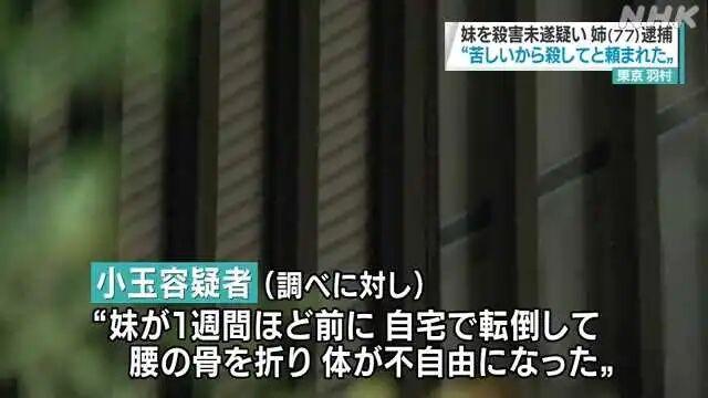 9月20日案发当天,妹妹拜托姐姐杀死自己。于是,77岁的姐姐小玉喜久代用电线勒死了74岁的妹妹后藤喜美子。