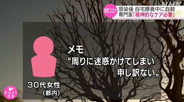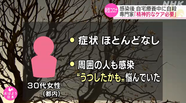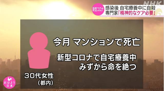 据日本NHK报道,东京一名感染新冠病毒的女性患者,居家疗养期间,自杀身亡。