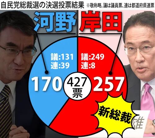 最终,岸田文雄获得257票,河野太郎,则大幅落后,获得170张大选票。