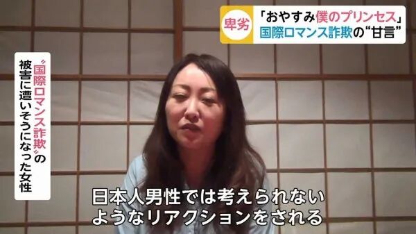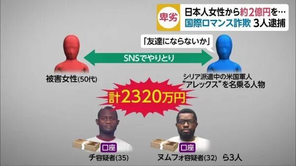 受害人是一名五旬日本妇人。她以为自己和一个被派去利比亚执行任务的美国军官在谈恋爱。为了能和她一起定居日本,美国军官决定辞职,为此得支付一大笔费用。妇人给骗子汇了2320万日元。