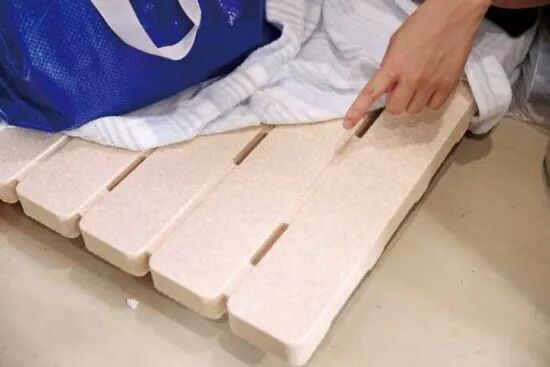 这个6平米不到的小仓库,堆放着一些油漆桶、扫帚拖把等杂物。他把两块防潮板拼起来,做成一张勉强可以睡的床。