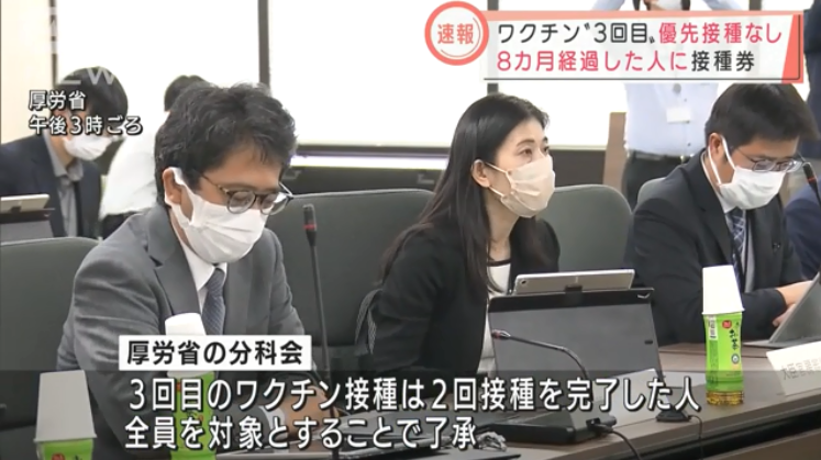 10月28日下午,日本厚生劳动省召开专家分科会,与会专家们达成一致:所有接种完第一针、第二针的人,都是第三针的接种对象。