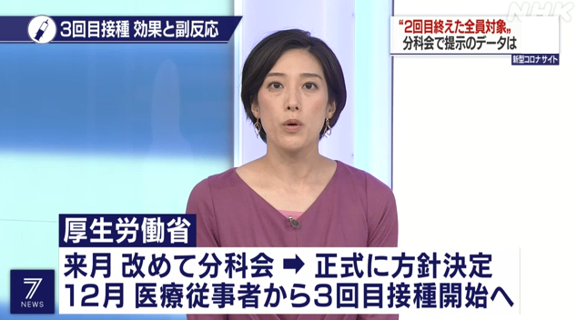 厚生劳动省根据专家讨论的结果,下个月正式决定接种第三针的方针。计划今年12月,先让医疗从业人员接种,再针对所有已经接种完两针的民众,全面开始第三针的接种。