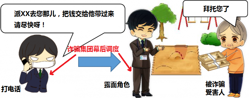受害人上当后,骗子派出一个“露面”的,跟受害人碰面,直接收钱。或者,拿到从受害人那儿骗来的信用卡,去ATM取钱。