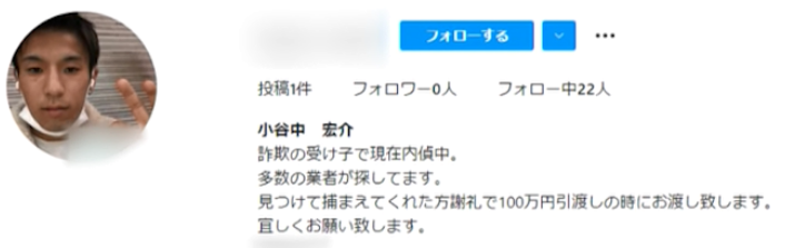 说小谷中宏介作为诈骗案中的露面人,正在被内部侦查。有多家同行都在找他。给抓住他的人士奉上100万日元谢礼。