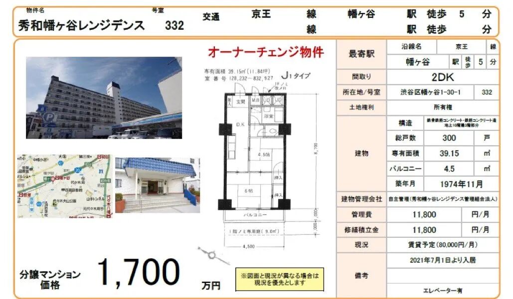 可它一个单位的市面价却比同地段同房龄面积的,要便宜了两三成。比如,其它楼的一个单位可以卖2300万日元,秀和幡谷府邸的只能卖1700万日元。