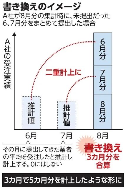 国交省呢,则把A公司这三个月的总量,全都算作8月份一个月的量。没提交数据的6月、7月,国交省就在这两个月的空框里,分别填上6月份和7月份的整体统计平均值。