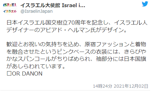 2021年是日本与以色列建交70周年。以色列驻日大使馆的官推还喜滋滋地告诉日本网民:粉色裙子融合了原宿时尚文化与和服元素。袖口部分表现了日本国旗。这个设计包含了欢迎与庆贺的心意。