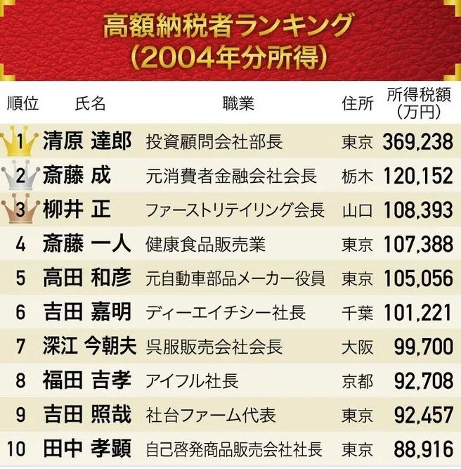 所以,最后一次根据纳税金额来推算收入的日本富豪榜,也停留在了2004年。