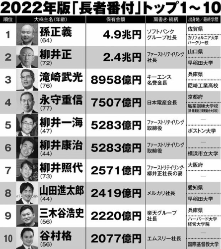 孙正义以4.9兆日元重回首富宝座,前首富柳井正则屈居第二。