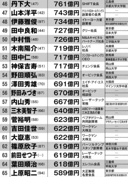 此外,柳井正的两个儿子柳井一海、柳井康治,以及妻子柳井照代分别以5283亿、5283亿、2571亿排名第五、六、七位。