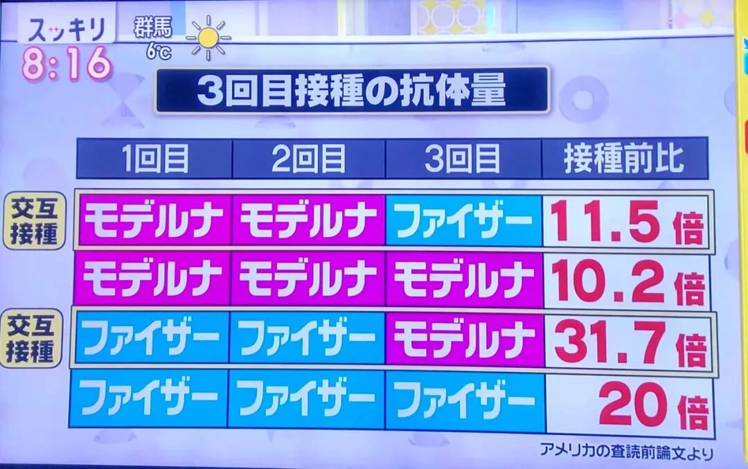 这是今早直播节目《スッキリ》罗列出来“三针接种后的抗体数量”。