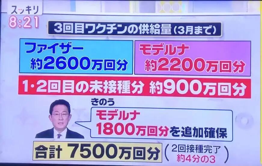 另外,日本国内用于第三针接种的疫苗,到3月底为止,共计7500万剂。其中辉瑞约2600万剂。