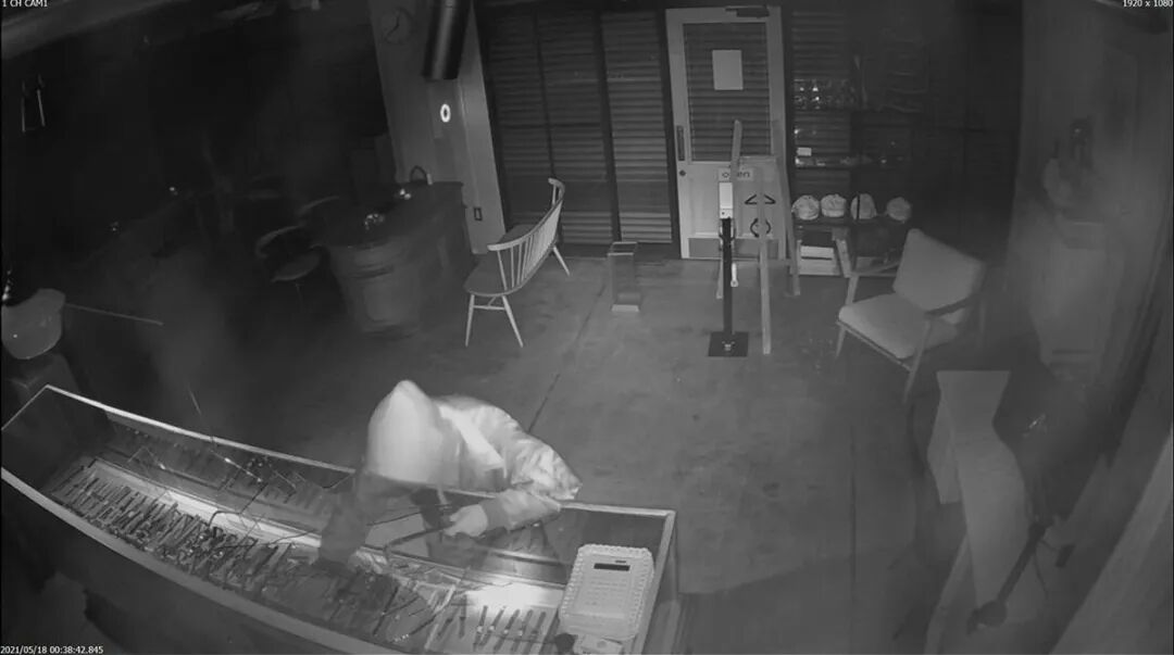 一名不速之客从外面砸开手表店的厕所窗户,钻进店内。他直奔陈列手表的柜台,用撬棍砸碎柜台玻璃。