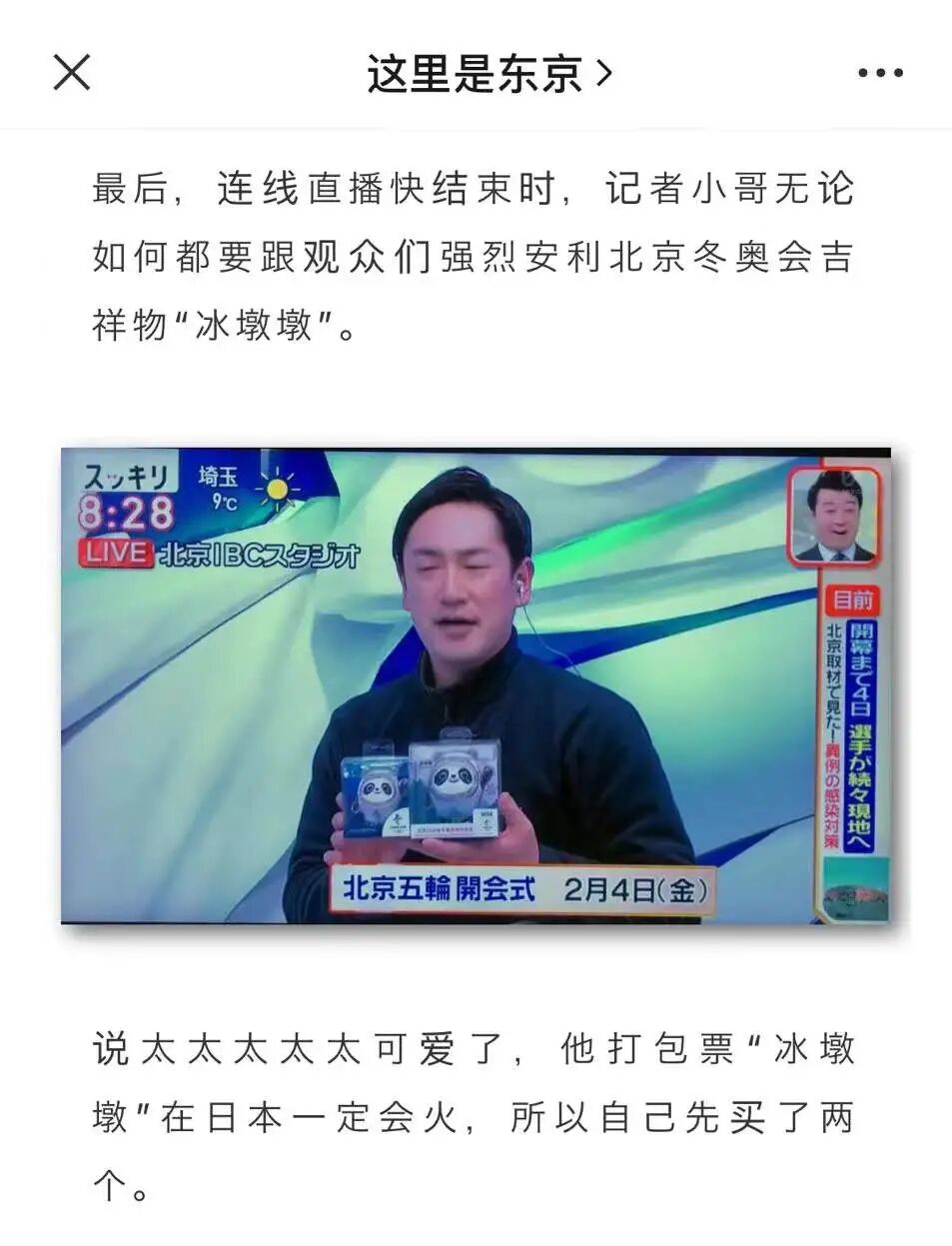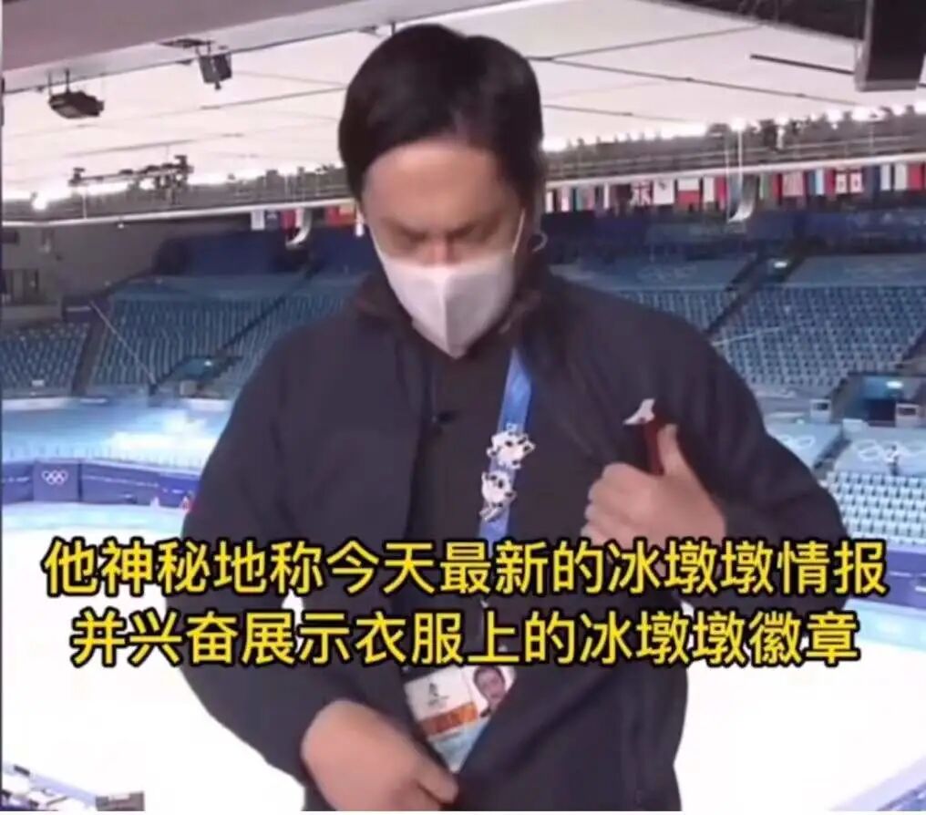 他每天都要跟东京演播厅进行直播连线,报道冬奥会最新情况。但每天,是每天哦,他都要千方百计,见缝插针地跟观众们安利他的“冰墩墩”。像极了饭圈女孩到处安利她家哥哥。