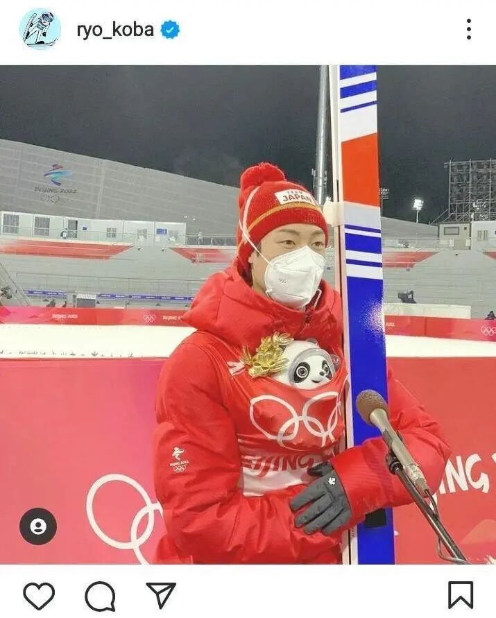 小林陵侑获奖后接受采访时,把冰墩墩装在胸口,两个脑袋瓜同框的画面可爱极了。他自己也非常喜欢记者给他和冰墩墩拍的合照,在个人SNS上特地用了这张照片。