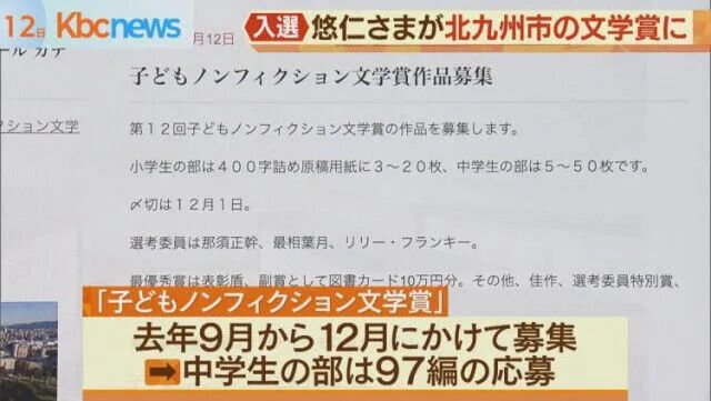 悠仁作为御茶水女子大学附属中学的“最优秀”学生,得有足够的说服力。不久前,他的一篇作文参加北九州市的作文竞赛获奖了。