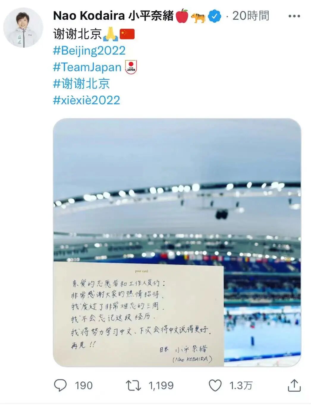 北京冬奥会最后一天,日本著名速滑选手小平奈绪在个人社交帐号上发布推文“谢谢北京”,并附上一张照片。