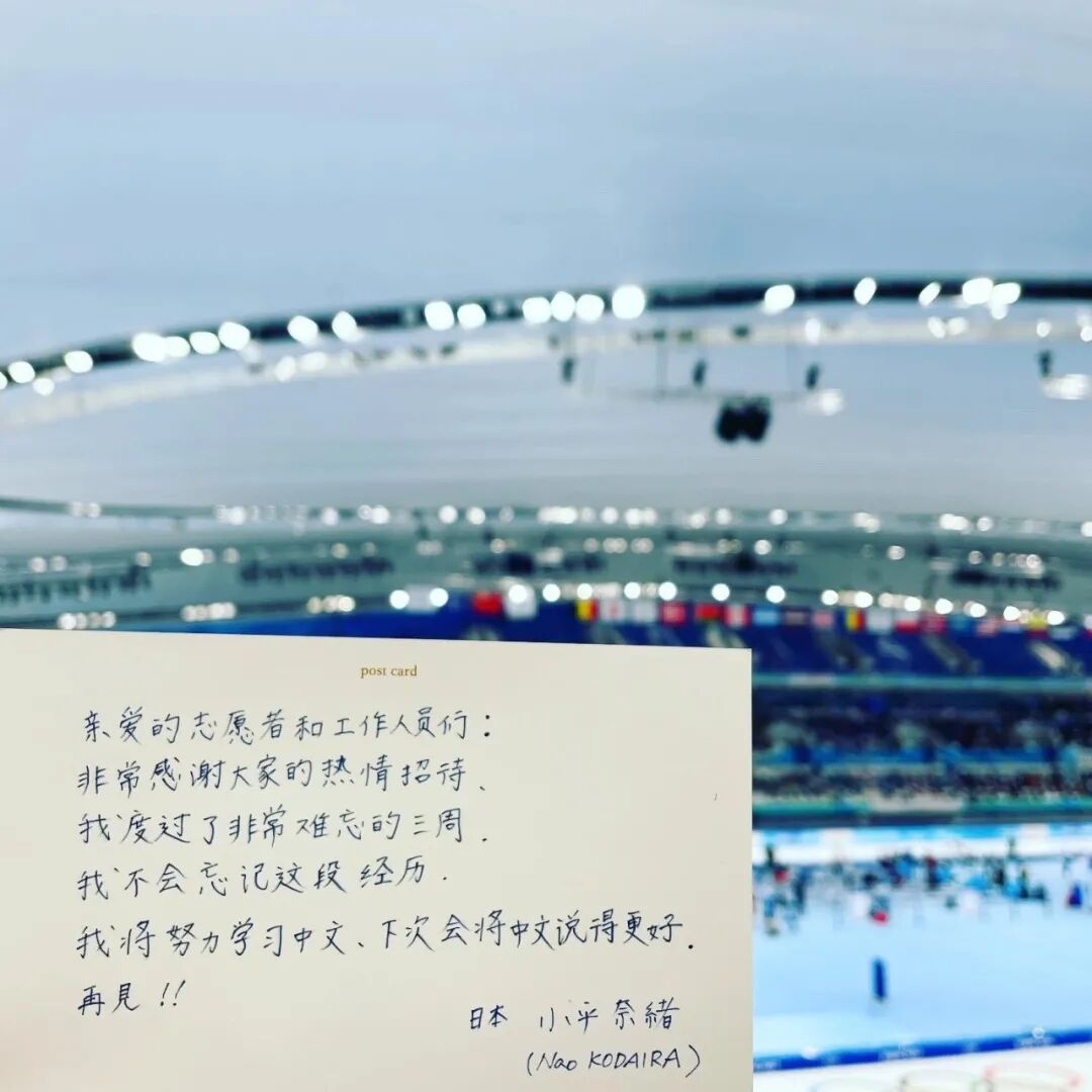 照片以国家速滑馆为背景,映衬着一张明信片,上面手写着:亲爱的志愿者和工作人员们,非常感谢大家的热情招待,我度过了非常难忘的三周。我不会忘记这段经历,我将努力学习中文,下次会将中文说得更好。再见!!