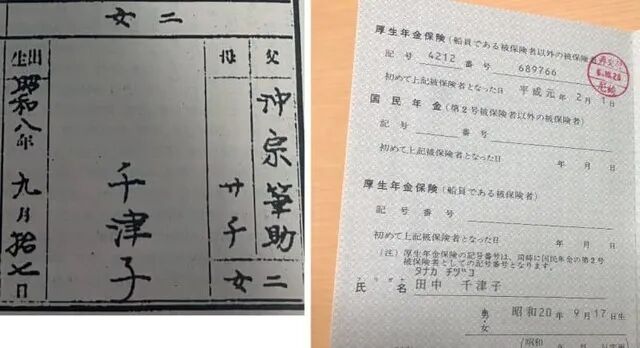 根据当年的出生记录,发现千津子的真实出生年份为1933年,而她那张田中千津子名义的养老卡上却写成1945年。