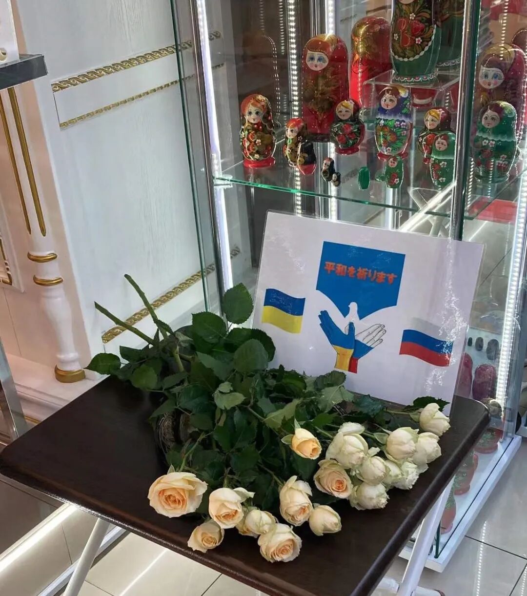 还特地在店门口摆放了希望俄乌友好的海报,表达祝福的鲜花。