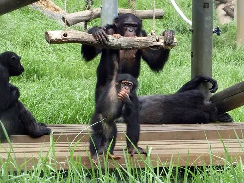 德基的身形比凯大了一圈,刚开始,凯很怕它。渐渐发现,这个大只佬很厚道,凯接受了德基,也接受了小樱。再到后面,凯已经不害怕其它黑猩猩了。