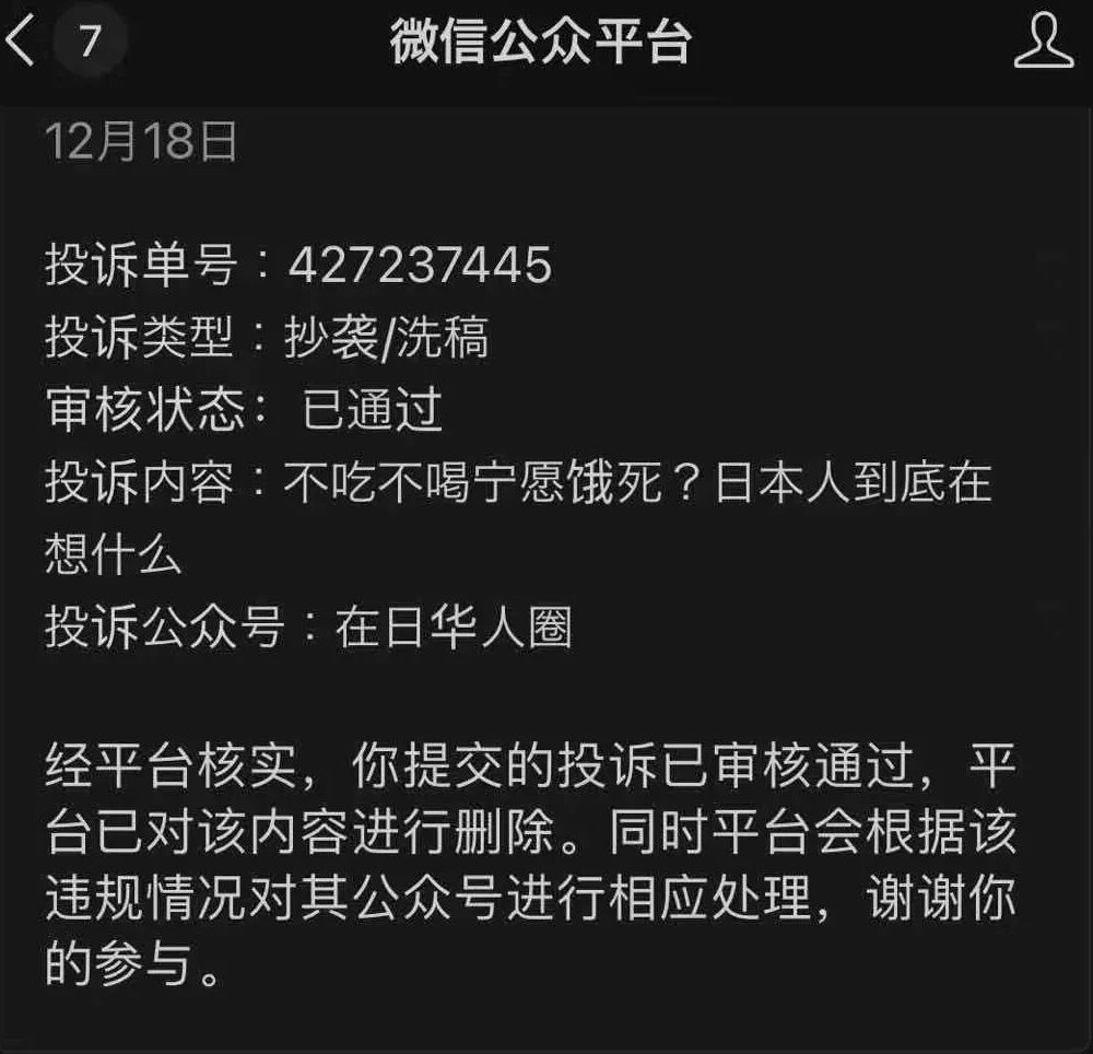 公众号“在日华人圈”12月17日的推送文《不吃不喝宁愿饿死?日本人到底在想什么》,系抄袭我号12月15日的原创推文《日本又有一对母女饿死在家中……》。